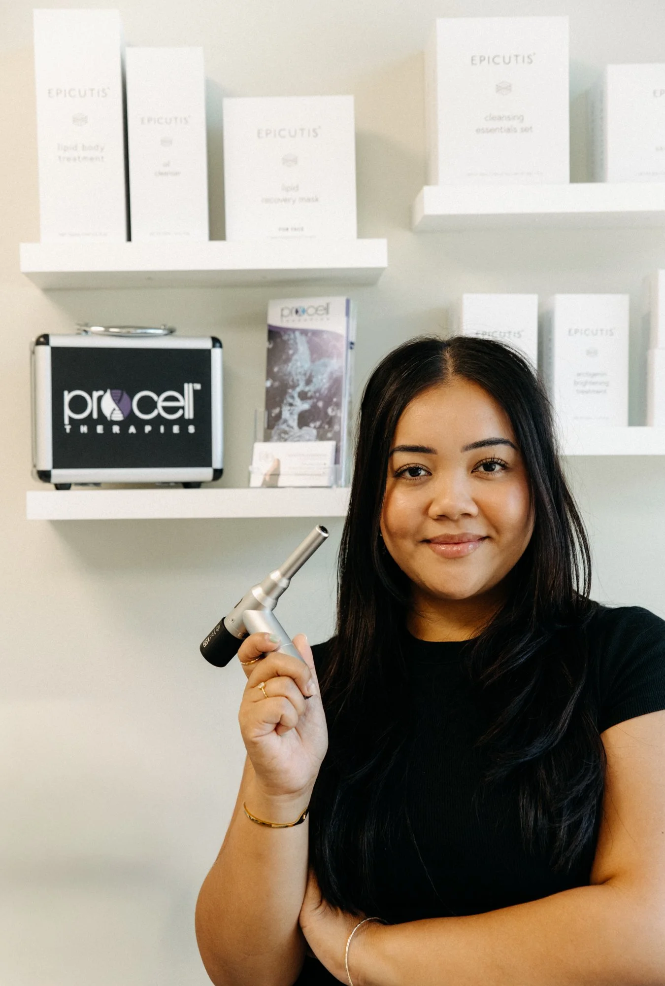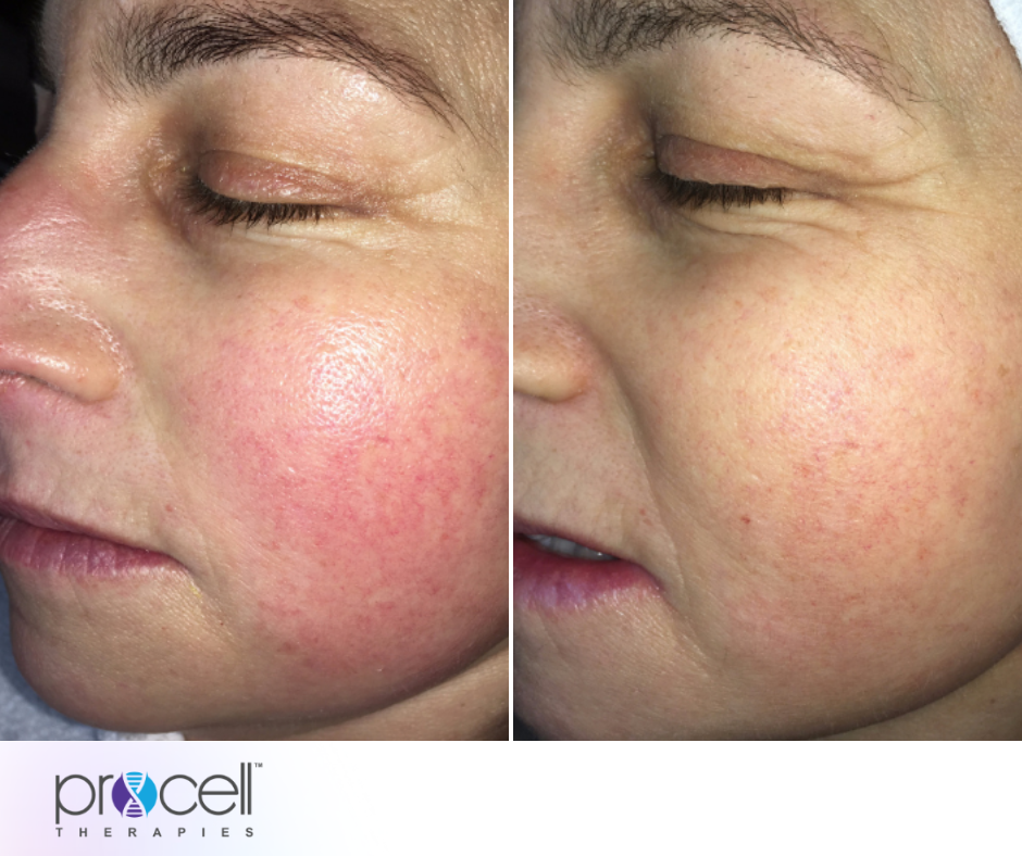 The treatment begins with thorough cleansing and prepping of the skin. A Procell device is used to create microchannels while applying potent serums. The treatment may feel slightly prickly but is well tolerated. You may look pink for a few hours after therapy.